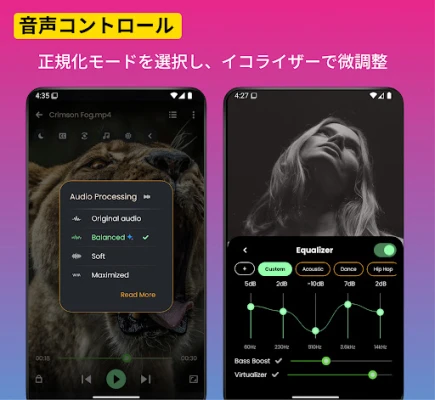 Night Media Playerは、HD、4K、そして8KのUltra HDコンテンツまで、HW+アクセラレーションを介して驚くほどスムーズに再生します。独自のビデオ品質ブースターは、既存の映像も高画質化し(デバイス性能に依存)、明るさ、コントラスト、彩度など10種類以上のパラメータをリアルタイム調整可能。プロフェッショナルなカラーコレクション、ダイナミックな調整、カスタムプリセットで、映像を映画のように変貌させます。音響においては、突然の音量変動を排除するスマート音声正規化、低音量でも明瞭な会話を保証するボイス強化が特徴。最大300%のスマートオーディオブースト、ダイナミックレベリング、ナイトモードが、ヘッドフォンや夜間視聴時でも心地よいクリアでパワフルなサウンドを提供します。