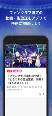 「ときのそら」の世界をもっと深く、もっと身近に。公式ファンクラブの専用アプリが、あなたの日常に彩りを加えます。活動の最新情報はもちろん、ここでしか見られない特別な瞬間まで、手のひらでいつでもアクセス可能です。ファンと「ときのそら」を繋ぐ、新たなコミュニティ体験がここから始まります。