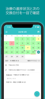 TrayMinderでは、複雑な登録作業なしに数秒で治療計画を開始できます。現在の治療から新しいプランまで、いつでも柔軟に設定や調整が可能です。複数のタイムゾーンや夏時間にも自動で対応するため、海外滞在中でも正確な記録が保たれます。また、歯科医院への通院日やマウスピース交換日をカレンダー上で管理し、重要な予定を忘れることはありません。日々の装着結果は色分けされたカレンダーで一目瞭然。必要に応じて、ホームドクターへマウスピースの使用状況をメールで共有することもでき、治療の透明性を高めます。